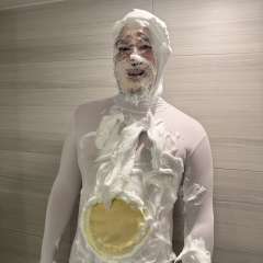 Michiganpie1 was surprised by Catguy4 with a big sloppy cream pie to the face